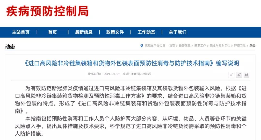 近日,国家卫健委出台《进口高风险非冷链集装箱和货物外包装表面预防性消毒与防护技术指南》,从环境、物品、人员等各环节的关键风险点入手,提出具体措施及技术要求,科学规范了进口高风险非冷链货物需采取的预防性消毒和个人防护措施(以下为指南内容)。